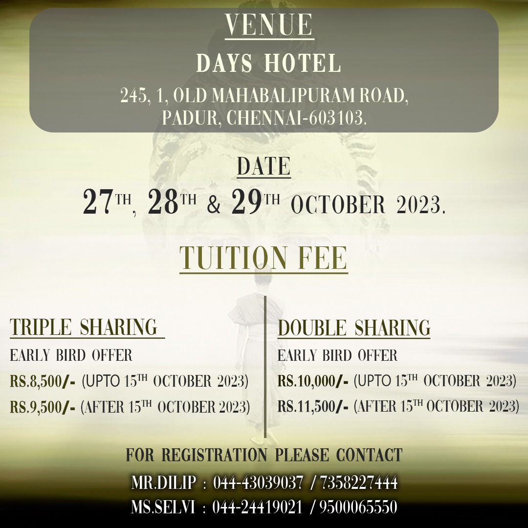 From 10.30am to 6.30pm On 01/07/23 & 02/07/23 For Registration please contact Ms Selvi on 044 24419021/28. At Healing Consultancy Pvt Ltd before the 29/06/23